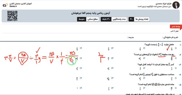 حل سوالات تستی فصل کسر ریاضی پنجم
