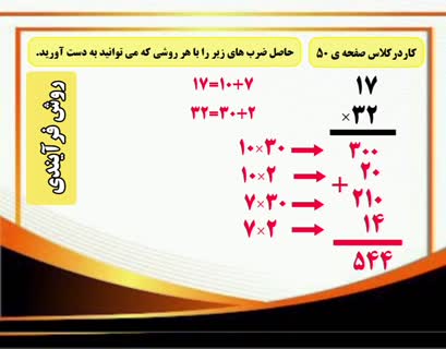 ریاضی کلاس چهارم، حل کار در کلاس صفحهی 50، آموزش ضرب تکنیکی، فرآیندی و مساحتی