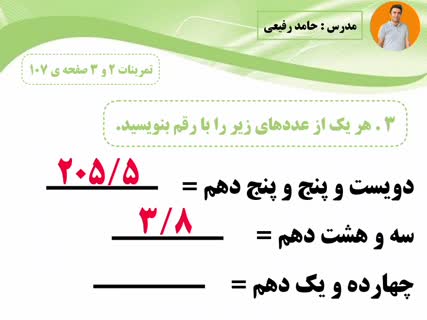 قسمت 2 - صفحه 107 - جواب تمرین 2 و 3 صفحهی 107 ریاضی چهارم | با حروف و رقم نویسی اعداد اعشاری