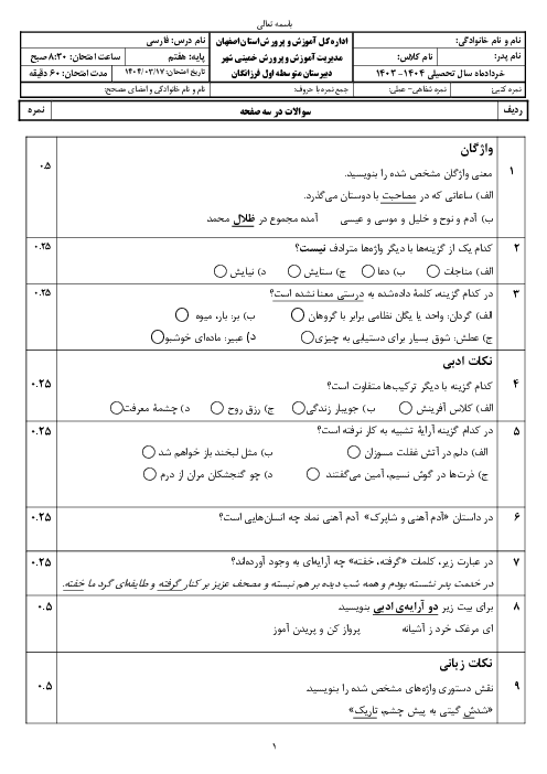 توجه: آزمون ویژه دانش آموزان مدارس روزانه، بزرگسال و داوطلبان آزاد در نوبت خرداد سال 1403 توسط مرکز ارزشیابی و تضمین کیفیت نظام آموزش و پرورش برگزار شده است.