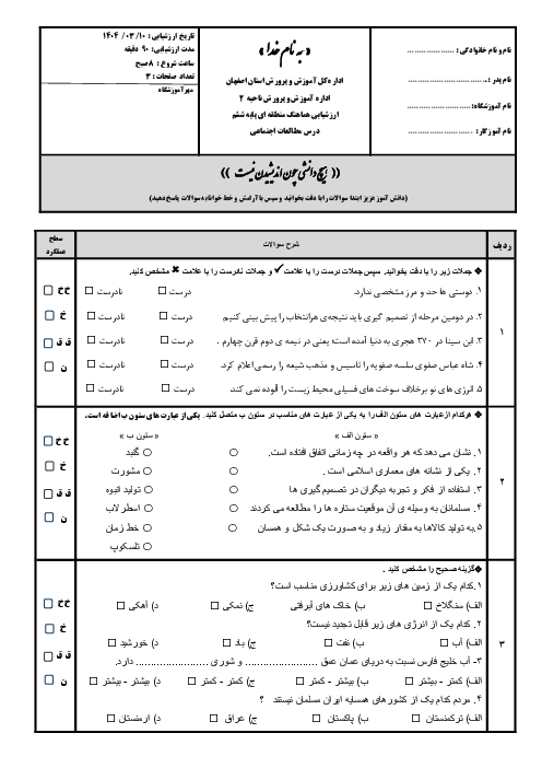 آزمون نوبت دوم مطالعات اجتماعی ششم هماهنگ ناحیه 4 اهواز | اردیهشت 1403