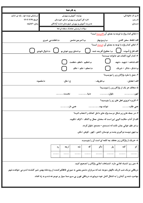 دبستان ششم فارسی کرمان عشایری اردیبهشت 1404