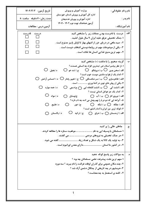 شامل 30 سوال تشریح - جای خالی - صحیح غلط و تستی