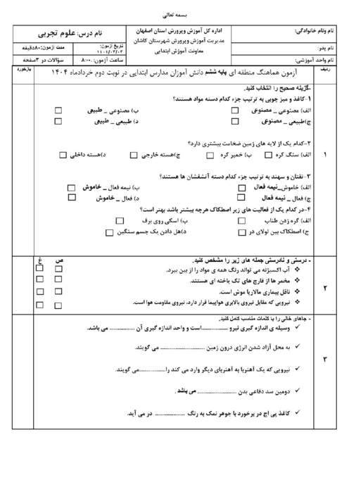 سوالات آزمون نوبت دوم علوم تجربی ششم هماهنگ ناحیه 4 مشهد | خرداد 1401 (نوبت صبح)